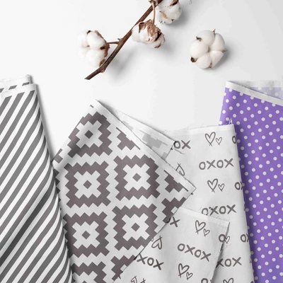- This Bacati 4-piece Crib Set Includes Reversible Comforter/Playmat (33 x 43 inches), Crib fitted sheet (52 x 28 x 6 inches), Crib Skirt/Dust ruffle (13 inch drop) and Diaper Stacker (holds more than 30 newborn diapers) in fun, colorful and signature prints in 100 percent cotton 200 Thread Count percale fabrics. Designed in United States by Experienced Designers. Many coordinating items available to purchase separately in this Bacati Love Gray Lilac Bedding Collection.
