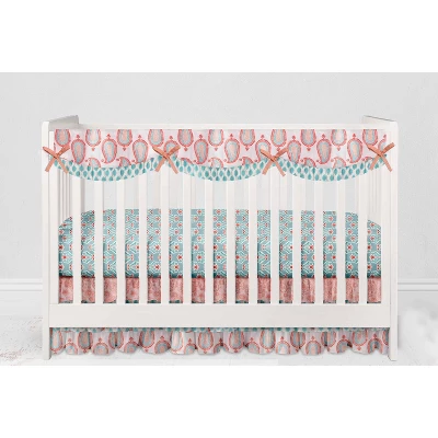 - This Bacati 6-piece Crib Set Includes Reversible Comforter/Playmat (33 x 43 inches), Crib fitted sheet (52 x 28 x 6 inches), Crib Skirt/Dust ruffle (13 inch drop) Diaper Stacker (holds more than 30 newborn diapers), Reversible Long Crib Rail Guard Cover (52 x 12 inches) and Window Valance (15 h x 56 w inches with 1.75 inch Rod Pocket) in fun, colorful and signature prints in 100 percent cotton 200 Thread Count percale fabrics. Designed in United States by Experienced Designers. Many coordinating items available to purchase separately in this Bacati Paisley Sophia Coral Aqua Bedding Collection.