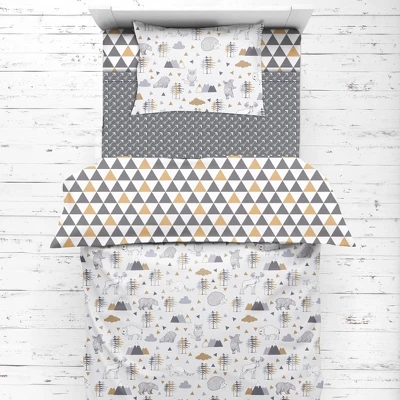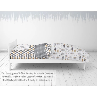 - This Bacati 4-piece Toddler Bedding Set Set Includes Reversible Oversize Comforter (42 x 55 inches), Toddler Bed Fitted Sheet(52 x 28 x 6 inches), Toddler Bed Flat Sheet(52 x 42 inches) which is fitted at the bottom to make the bed easily and Standard Pillow Case (20 x 25 inches) with french ties on the back in fun, colorful and signature prints in 100 percent cotton 200 Thread Count percale fabrics. Designed in United States by Experienced Designers. Many coordinating items available to purchase separately in this Bacati Woodlands Beige Gray Bedding Collection.