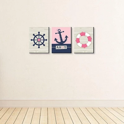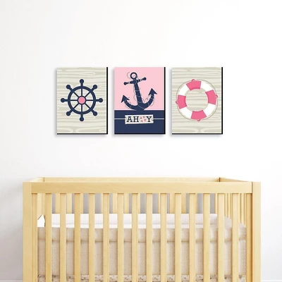 Ahoy – Nautical Girl Wall Art Set INCLUDES 3 ready-to-hang anchor themed panels and non-marking wall mounts for easy hanging. Ahoy – Nautical Girl artwork is perfect for a nursery, kids room or playroom. Ahoy – Nautical Girl Wall Art & Kids Room Decor SIZE each 10 inches high x 7.5 inches wide x .5 inches thick. Ships wheel lightweight art prints will arrive ready to use – no frame needed. The black edge gives each print a modern, finished look. EASY TO HANG: Simply attach a non-marking wall mount (included) to each corner of an Ahoy – Nautical Girl art panel and press to hang in desired location. Wall mounts are repositionable, so you can redesign your artwork display at any time. PREMIUM HOME DECOR: 3-piece Ahoy – Nautical Girl Wall Art Set is professionally printed on thick material with a black edge. You will not need to frame this set of life preserver room decor. Each standout print is ready to hang and will add a contemporary touch to any room. MADE IN THE USA: Ahoy – Nautical Girl – Pink Nursery Wall Art & Kids Room Decor is designed and manufactured at our Wisconsin facility using materials that are Made in the USA.