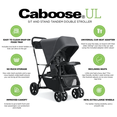 The joovy Caboose UL is designed to give independent, restless toddlers some freedom while your baby sits up front. The new joovy Caboose UL has design improvements including larger rear wheels for better maneuverability, an upgraded sunshade for rear passengers, a 4-position adjustable footrest, and seat side pockets. The handlebar is equipped with an included, sturdier parent organizer and the storage basket has a higher weight capacity. The seat has been upgraded with a taller seatback and a padded 5-point harness. The design changed slightly to add to the functionality of this stroller: the new quick-release wheels make the assembly a breeze, the auto-lock makes the foldquick, and the upgraded canopy extension system saves an extra step. Still with all the features loved from our original Caboose Ultralight like the bench seat, integrated stand-on platform and the large canopy. The joovy Caboose UL fabrics’ 100% recycled material each made from over 50 recycled water bottles. It has a simple seat recline system, parking brake and comes included with a universal car seat adapter.