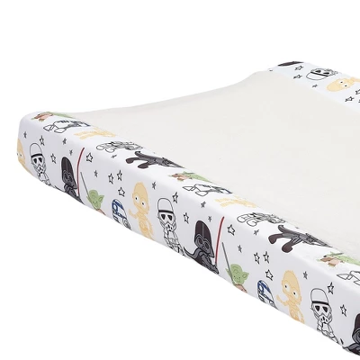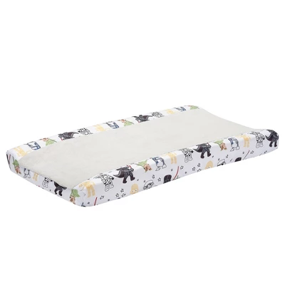 A soft, luxurious gray fleece center is perfect for changing your little padiwan (Jedi-in-training). The side panels are a soft microfiber fabric featuring your favorite Star Wars characters. There are buttonholes for the changing pad straps so your little one is safe and secure while getting their diaper changes. There is elastic on the short sides in order to fit securely on a standard sized changing pad measuring 32” X 16”. It is machine washable for easy care.