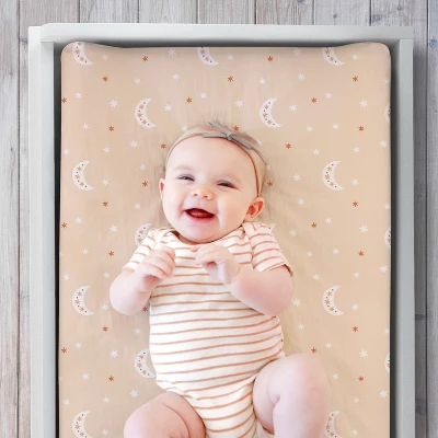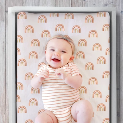 The Boho 3-Pack Changing Pad Covers by The Peanutshell add effortless style to any nursery. Soft and gentle fabrics in warm earth tones are crafted with utmost care. The dusty coral, peach, and tawny brown bohemian designs feature rustic rainbows, celestial moons, stars, and stellar suns. Elasticized edges guarantee a secure fit on most standard-sized changing pads. Mix and match the covers to create a warm neutral look!