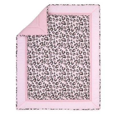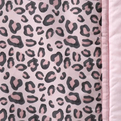 Your little one will find bedtime simply purrr-fect with The Peanutshell Leopard Blush 3-Piece Crib Bedding Set. Set includes a fun and playful printed quilt, matching printed fitted sheet, and coordinating crib skirt. Quilt features a printed center panel with an updated classic of all-over leopard print in shades of pink and black, pieced with a large pink border and leopard print binding. Quilt reverses to a sweet pink solid color. Fitted sheet matches the playful quilt center print, while crib skirt has layers of ruffled chiffon. Quilt and sheet are super-soft and easy to clean microfiber, perfect to cuddle and care for your little one; crib skirt is light-as-a-feather polyester chiffon. Sweet leopard print is the perfect ground for your little one to rest, and will send baby to bed with prowling on to new adventures.