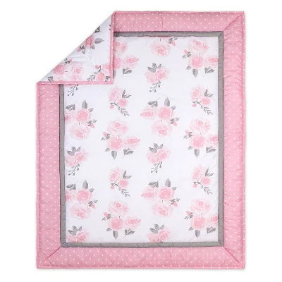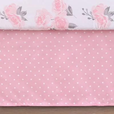 The Peanutshell Pink Floral 3-Piece Microfiber Crib Set fits well in any little girl’s room with its color palette of shades of pink, gray, and white, with a sweet and sophisticated floral and polka dot motif. Quilt features a printed center panel of watercolor-inspired roses, with a border in a sweet and simple polka dot, pieced with a neat and clean gray border and stitch-through quilting details. Fitted sheet ties back to the quilt with the same watercolor floral print, and the 3-sided dust ruffle matches the polka dot in the quilt and finishes off this set perfectly! Microfiber fabric is touchably soft and the easiest of care. Set includes quilt, fitted sheet, and 3-sided dust ruffle. Perfect for your little girl’s room and works perfectly with many of the PS Microfiber 2Pk sheet sets and other accessories!